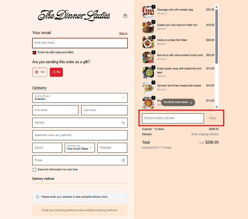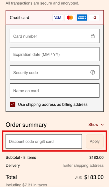 Tip: Enter your gift card before adding other checkout details, as applying the card refreshes the page and could remove previously entered info.